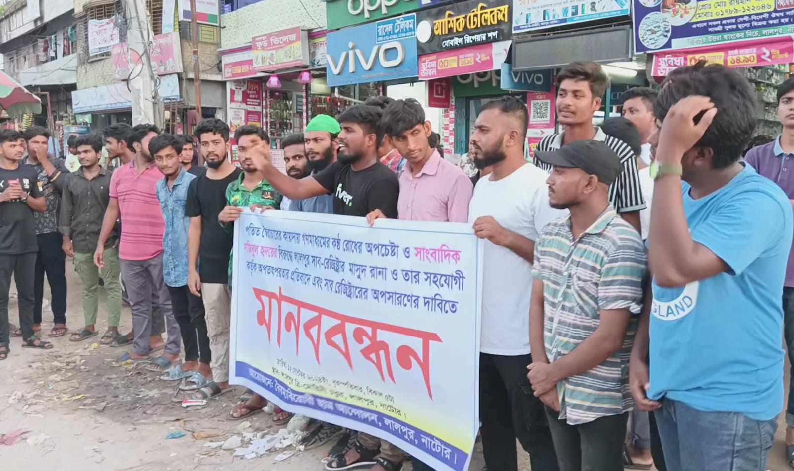 সেই কর্মসূচির সংবাদ প্রচার করায় সাব-রেজিস্ট্রার মাসুদ রানা বাংলাদেশ টুডের লালপুর প্রতিনিধি সজিবুল ইসলাম হৃদয়ের বিরুদ্ধে অপতৎপরতা চালানোর প্রতিবাদ ও নিন্দা জানান। মানববন্ধনে লালপুর বৈষম্য বিরোধী ছাত্র আন্দোলনের সমন্বয়ক আব্দুল্লাহ আল বাকির সঞ্চলনায় বক্তব্য রাখেন লালপুর প্রেসক্লাবের সভাপতি আব্দুল মোতালেব রায়হান, সহ-সভাপতি সাহীন ইসলাম, সালাহ উদ্দিন, শিক্ষার্থী সজিব মাহমুদ প্রমূখ।