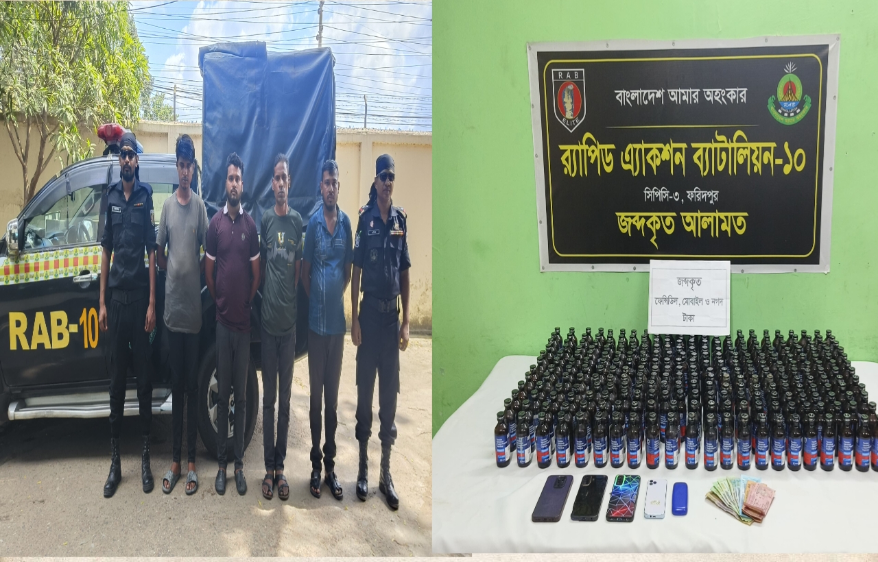 গতকাল ২৪ সেপ্টেম্বর ২০২৪ র্যাব-১০, সিপিসি-৩ ফরিদপুর ক্যাম্পের একটি আভিযানিক দল গোপন সংবাদের ভিত্তিতে জানতে পারে যে, কতিপয় মাদক ব্যবসায়ী একটি মাদকদ্রব্যের চালান নিয়ে মোটরসাইকেল যোগে ফরিদপুর জেলার ভাঙ্গা থানাধীন ভাঙ্গা মোড় হয়ে রাজধানী ঢাকা’র উদ্দেশ্যে রওনা করেছে। উক্ত সংবাদের ভিত্তিতে র্যাব-১০, সিপিসি-৩ ফরিদপুর ক্যাম্পের উক্ত আভিযানিক দল গতকাল ২৪/০৯/২০২৪ সকাল ১১:০০ মিনিটে ফরিদপুর জেলার ভাঙ্গা থানাধীন ভাঙ্গা টোল প্লাজা এলাকায় একটি অস্থায়ী চেকপোস্ট স্থাপন করে। তার কিছুক্ষণ পর সকাল ১১:২০ মিনিটে ০২টি মোটরসাইকেল উল্লেখিত র্যাবের চেক পোষ্টের সামনে পৌছালে র্যাব সদস্যরা মোটরসাইকেল দুইটি থামিয়ে মোটরসাইকেলে থাকা ০৪ জন আরোহিকে অধিকতর জিজ্ঞাসাবাদ করলে একপর্যায় তারা তাদের কাছে মাদকদ্রব্য আছে বলে স্বীকার করে। অতঃপর উক্ত চেক পোস্টে কর্তব্যরত র্যাব সদস্যরা মোটরসাইকেল দুটি তল্লাশি করে এবং মোটরসাইকেলের পাশে ঝুলানো আরোহিদের দেখানো ও বের করে দেওয়া ০২টি ব্যাগের ভিতর হতে আনুমানিক ৮,৩১,০০০/- (আট লক্ষ একত্রিশ হাজার) টাকা মূল্যমানের ২৭৭ (দুইশত সাতাত্তর) বোতল ফেনসিডিলসহ ০৪ জন আসামীকে গ্রেফতার করে। গ্রেফতারকৃত আসামীদের নাম ১। মোঃ জালাল উদ্দিন @ জালাল (২৬), পিতা-মোঃ মনিরুল ইসলাম, সাং-জয়রামপুর থানা-দামুড়হুদা, জেলা-চুয়াডাঙ্গা, ২। মোঃ জীবন ইসলাম সাজ্জাদ (৩০), পিতা-মোঃ শহিদুল ইসলাম হাওলাদার, মাতা- সাজেদা বেগম, সাং-পূর্ব বুরদিয়া ০৫ নং ওয়ার্ড, থানা- লৌহজং, জেলা- মুন্সিগঞ্জ, ৩। মোঃ মিন্টু মোল্লা (৩৫), পিতা-মৃত আশরাফ মোল্লা, সাং-শংকরপুর, থানা-কোতয়ালী, জেলা-যশোর ও ৪। মোঃ আনিসুজ্জামান তুহিন (৩৬), পিতা-মৃত শাহাজাহান বিশ্বাস, সাং-বান্তপুর, থানা-দামুড়হুদা, জেলা-চুয়াডাঙ্গা বলে জানা যায়। এ সময় তাদের নিকট থেকে মাদক বহনে ব্যবহৃত ০২টি মোটরসাইকেল জব্দ করা হয়।