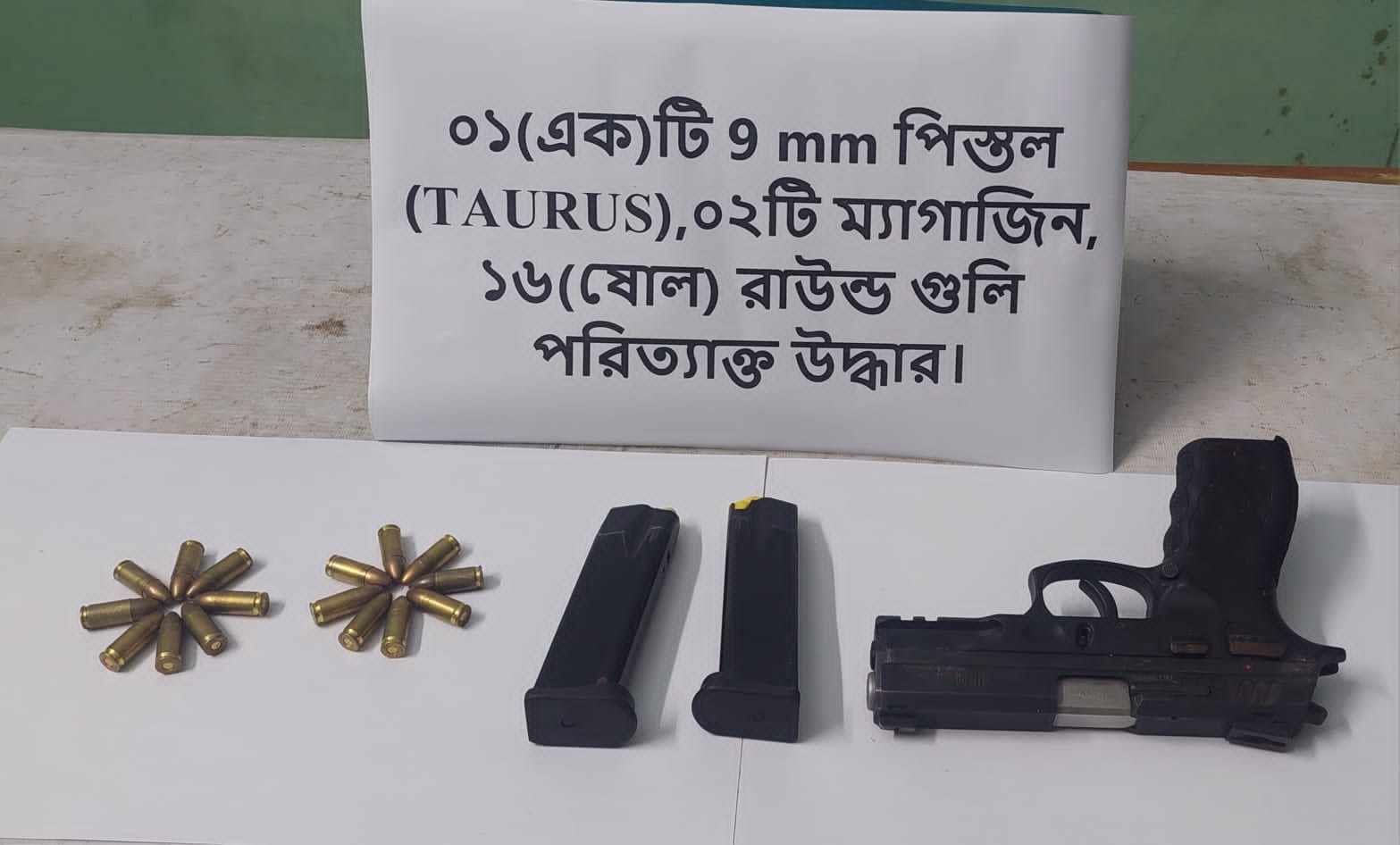 বাকলিয়া থানা পুলিশ কর্তৃক পরিত্যক্ত অবস্থায় উদ্ধার একটি পিস্তল, দুইটি ম্যাগাজিন ও ১৬ রাউন্ড গত২৪ সেপ্টেম্বর দিবাগত রাত ০১.১৫ ঘটিকার সময় বাকলিয়া থানা পুলিশ গোপন সংবাদের ভিত্তিতে জানতে পারে যে, বাকলিয়া থানাধীন মেরিন ড্রাইভ রোডস্থ ফিশারিঘাটের আগে স্লুইস গেইট এলাকায় একটি আগ্নেয়াস্ত্র আছে। প্রাপ্ত সংবাদের সত্যতা যাচাইয়ের জন্য বাকলিয়া থানার অফিসার ইনচার্জ ইখতিয়ার উদ্দিন সঙ্গীয় এসআই (নি.) মোঃ সোহেল রানা, এসআই (নি.) এ কে এম জালাল উদ্দিন, এসআই (নি.) মোঃ ইকবাল হোসেন ভূঁইয়া সঙ্গীয় ফোর্সসহ গতরাত ০১.২৫ ঘটিকায় গোপন সূত্রে প্রাপ্ত তথ্যের এলাকায় পৌঁছে আশেপাশে বসবাসরত লোকজনদের সহযোগিতায় তল্লাশি অভিযান পরিচালনা করেন। তল্লাশি অভিযানের এক পর্যায়ে রাত আনুমানিক ০১.৫৫ ঘটিকায় বাকলিয়া থানাধীন মেরিন ড্রাইভ রোডস্থ নবাব খাঁ কলোনিসংলগ্ন স্লুইস গেইটের পূর্ব পাশে রাস্তার ঢালে ঝুপড়ির ভিতর থেকে একটি সাদা প্লাস্টিকের ব্যাগের ভিতর মোড়ানো একটি 9 mm পিস্তল (TAURUS), ০২টি ম্যাগাজিন ও ১৬(ষোল) রাউন্ড গুলি পরিত্যাক্ত অবস্থায় পেয়ে উপস্থিত স্বাক্ষীদের সম্মুখে এসআই (নি.) মোঃ ইকবাল হোসেন ভূঁইয়া জব্দতালিকা মূলে জব্দ করেন। এ সংক্রান্তে বাকলিয়া থানায় একটি সাধারণ ডায়েরি করা হয়েছে।
