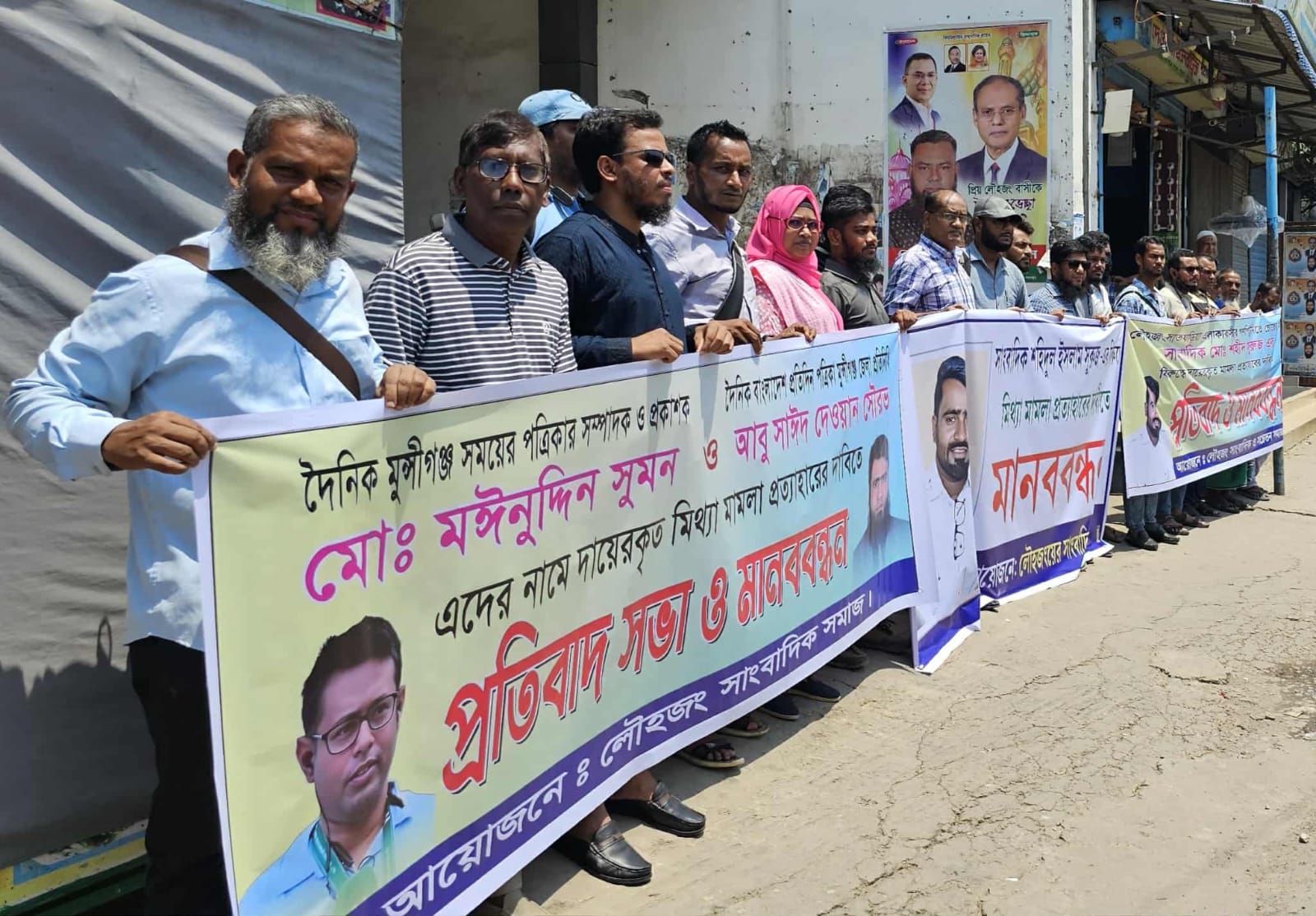 মুন্সীগঞ্জের লৌহজংয়ে তিনজন সাংবাদিকের বিরুদ্ধে মিথ্যা মামলা প্রত্যাহারের দাবীতে মানববন্ধন ও প্রতিবাদ সমাবেশ হয়েছে। আজ (১১ এপ্রিল) শনিবার বেলা সাড়ে ১১টার দিকে হলদিয়া বাজারে অবস্থিত বিক্রমপুর প্রেসক্লাবের সামনে লৌহজং সাংবাদিক সমাজের ব্যানারে এ মানববন্ধন অনুষ্ঠিত হয়।