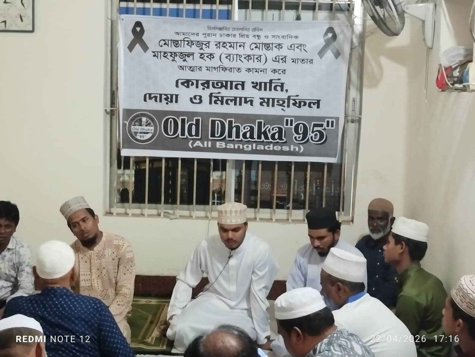 দোয়া ও মোনাজাত পরিচালনা করেন। হাফেজ মোহাম্মদ আলাউদ্দিন। এসময় উপস্থিত ছিলেন ওল্ড ঢাকা ৯৫ এর এডমিন রিয়াজুর রহমান খান, সাইফুল ইসলাম, হান্নান সরকার,ব্যাংকার মাহফুজ শিপু, ওল্ড ঢাকা নাগরিক সমাজের মহাসচিব সানি মাহতাব,ঢাকা জার্নালিস্ট কাউন্সিল ডিজেসি এর সাধারণ সম্পাদক মো: মোস্তাফিজুর রহমান মোস্তাক, মাহিনুর আহমেদ,মনির চৌধুরী, মো,সাজু রহমান,রাজিব চৌধুরী, মুসাব্বির প্রমুখ। দোয়া শেষে মরহুমাদের আত্নার মাগফিরাত কামনা দোয়া করা হয়। শেষে তবারক বিতরণ করা হয়।